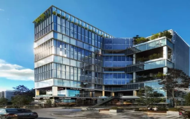 The tower includes high-speed elevators, 24/7 security, meeting rooms, high-speed internet, global brands, central air conditioning, ATMs, and an advanced firefighting system.
